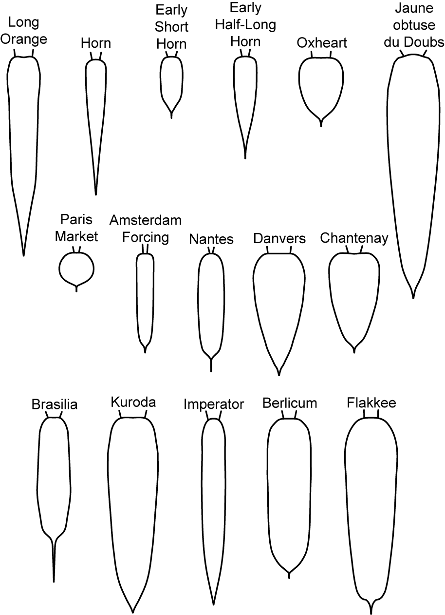 Fig. 1. Typical Carrot Root Shapes. Top row includes original European types; bottom two rows are major types grown worldwide today.